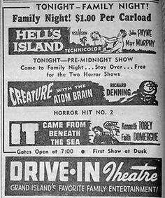 And, as you can see in the ad opposite, my parents were probably attracted by the $1/carload 'family night'. Nothing better for us kids than a night on 'Hell's Island' and getting to know the 'Creature with the Atom Brain.'