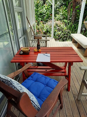 Sitting outside to write can be distracting because there are so many things to look at, to listen to, to sense: a gust of cooling breeze that brings the sea-salt smell up from the beach, the frantic tuis as they dart and dash amongst the trees like jet fighter planes, the neighbour's dog upset by the postman's cycle, the thump of bass from the kids down the road and their garage band.