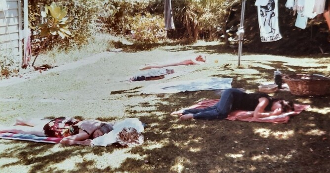This photo shows Mom in the foreground with her flowery suit and trademark palm-frond hat, and our two visitors fast asleep in the mid-and-backgrounds (and yes, the gentleman does have a bathing suit on). My skull and crossbones beach towel can be seen flapping on the clothes line and, after taking this photo, I grabbed it and lay down on the grass with the rest of the revellers.
